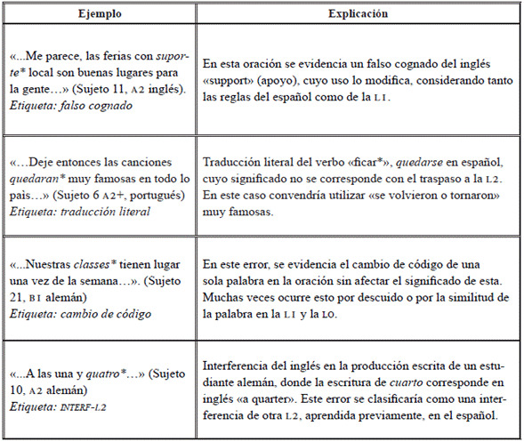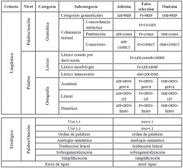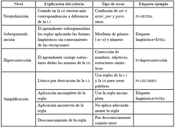 Considerando la presentación de la composición de las etiquetas y posibles procedimientos metodológicos para su uso, a continuación, se explica la taxonomía propuesta acorde con la identificación de errores producidos por la transferencia (interlingüísticos) y los errores referidos a los niveles de desarrollo que tiene la interlengua (intralingüísticos).
