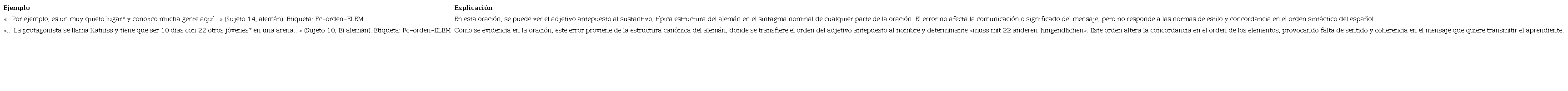 Con respecto a la primera clasificación, se encuentran las etiquetas correspondientes a problemáticas en las categorías morfosintácticas de género y número a nivel de los sintagmas (FS-CG-NUM/GEN). Es decir, cuando no existe concordancia entre el sustantivo y los modificadores dentro de los sintagmas. La tercera y cuarta etiqueta se refieren a errores detectados a nivel de la concordancia entre sujeto-cópula-atributo y sujeto-predicado en oraciones de predicado verbal. La quinta etiqueta corresponde a errores en las estructuras pasivas e impersonales de la oración, donde la mayoría de los casos se transfieren en inglés o alemán el uso de la segunda persona del singular como oraciones impersonales. Por último, los errores relacionados con el orden canónico de la oración responden a la estructura típica de las oraciones en español, las cuales en la producción de ELE se ven afectadas por la transferencia del orden en los sintagmas nominales y verbales, antecediendo los modificadores directos al núcleo de los sintagmas. Muchas veces, este cambio del orden no afecta el significado de la oración, pero, refiriéndose al estilo de la escritura, se consideraría un error irritable dentro de la comunicación. Obsérvense algunos ejemplos (Tablas 12 y 13).