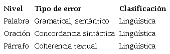 Como se observa en la Tabla 4, las categorías y profundidad se organizan de la siguiente manera: (1) gramática (categorías gramaticales y morfosintaxis de la conformación de la palabra), cuyo análisis opera al nivel de la palabra, el sintagma o la oración; por ejemplo, la omisión o adición de una categoría gramatical en un sintagma, entre otros; (2) ortografía, respecto del uso de la acentuación y la ortografía literal de los grafemas, cuya identificación se ubica en el nivel de análisis de palabra; (3) concordancia gramatical, que corresponde a las normas lingüísticas de concordancia entre los elementos de la oración, y cuyo análisis se localiza en el nivel de la oración, sintagma o párrafo; y (4) coherencia textual, en relación con el uso de los conectores y marcadores discursivos, correspondientes al nivel de análisis en el párrafo y la composición completa de la escritura.