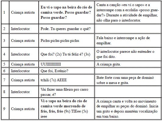 Percebemos, no episódio inicial, que as ecolalias «posso guardar» e a canção do sapo são acompanhadas dos gestos estereotipados de empilhar as peças do jogo de dominó, parecendo representar uma estratégia de recusa à interrupção da atividade, que seria guardar o objeto. Desse modo, a ecolalia não apresenta o sentido real da expressão. O funcionamento multimodal da negação da linguagem da criança marcado pela ecolalia e estereotipias também pode ser confirmado no episódio 2.
