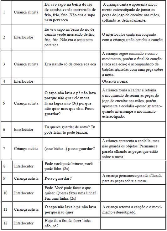 Os sentidos que emanam dos gestos associados à ecolalia, entendida como linguagem metaforizada, possibilitam a colocação de um lugar para a criança na linguagem, no instante em que o interlocutor marca em seu discurso o sujeito com base na chamada ao nome próprio e ao uso dos pronomes (linhas 2, 4 e 6) pela fonoaudióloga.