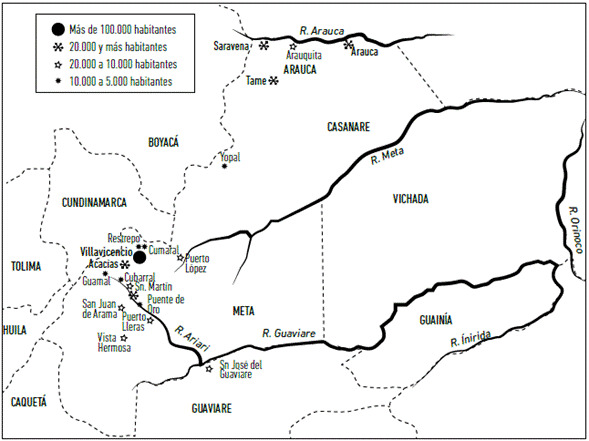 Adoptamos la visión de la historiadora norteamericana Jane Rausch (1940), quien ve los Llanos como escenario de contactos culturales, de difusión y de migraciones entre Los Andes, la región Caribe, la cuenca amazónica y la Guayana hasta mediados del siglo xvi, cuando llegaron los españoles y alteraron dicho panorama a través de proyectos como El Dorado, la encomienda, el esclavismo, la hacienda y la misión. Esta autora analiza la interrelación de los Llanos con la sociedad neogranadina, con el propósito de destacar la importancia de la región en el desarrollo cultural del país. El Guaviare es también frontera entre el mundo hispano y el mundo habitado por nativos americanos, región de instituciones y proyectos que iniciaron la incorporación de la Orinoquia al imperio español, al Virreinato que ejercía predominio andino, católico y blanco.