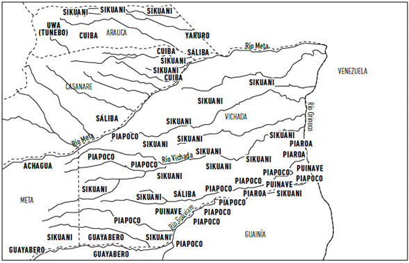 La obra de Rivero (1956) sobre historia de las misiones en los Llanos de Casanare y los ríos Orinoco y Meta delimita una región de los Llanos que iría de los ríos Casanare y Meta hasta el Orinoco. En las riberas del río Meta señala la presencia de indios caribes, araucas, tibibitibes, chaguanes, «guahivos»4, chiricoas y achaguas y, como es común denominador de todos los cronistas, habla de la presencia de indios caribes, sin hacer precisión alguna del origen del término o sobre su lengua. Gumilla (1984) considera a los caribes como la nación sobresaliente y dominante en el Orinoco, habitantes de la costa oriental hasta la Cayana [Guayana] autodenominados carina, gente, que ve a los demás como esclavos. En la tradición oral indígena sáliva provienen de unos gusanos enormes de donde: