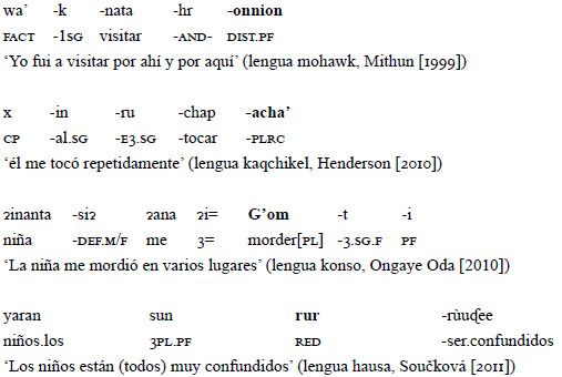 Los marcadores de pluriaccionalidad, recogiendo la definición de Lasersohn (1995), se añaden a los verbos para indicar multiplicidad de acciones, independientemente del número de participantes. A continuación, se muestran algunos ejemplos (citados en Součková, 2011) de las lenguas mohawk (Mithun, 1999), kaqchikel (Henderson, 2010), konso (Ongaye Oda, 2010) y hausa (Součková, 2011), donde el marcador de pluriaccionalidad está señalado en negritas.