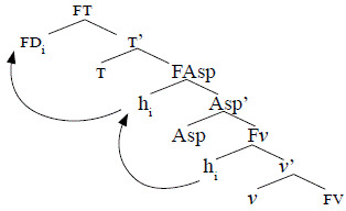 Para identificar las diferencias sintácticas y de estructura de las formas verbales que abordamos, es necesario definir qué son verbos de ascenso y verbos de control. Los verbos de ascenso son aquellos que no imponen ninguna restricción selectiva de sujeto, pues esta la realiza el verbo subordinado; en otras palabras, estos verbos no asignan rol temático al sujeto. Es el caso de los verbos seguir, venir, terminar, continuar, ir, llegar, andar, salir, estar, etc., a los que llamaremos verbos aspectuales. Siguiendo a Butt y Ramchand (2001), estas construcciones son monoclausales, pero mantienen los dos verbos como elementos separados. El verbo aspectual ocupa la posición de núcleo de la proyección funcional FAsp, el cual no tendrá especificador; por lo tanto, no habrá un causante externo percibido del evento. Luego, hay un evento e2 que es originado por e:. Debido a que no se le asigna rol 9 al especificador de FAsp, el argumento del FV sube a dicha posición y es realizado como sujeto. Podemos ver esta operación en la Figura 1: