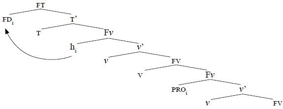 Por otro lado, los verbos de control seleccionan complementos preposicionales4 con sujetos tácitos. Una FD puede estar relacionada con dos v diferentes en condiciones léxicas/estructurales bien determinadas, como bien menciona Emonds5. Butt y Ranchand (2001) sugieren que en estos casos tenemos construcciones biclausales, es decir, dos estructuras argumentales distintas con dos posiciones de sujeto distintas. Por lo tanto, afirman los autores, se trata de dos complejos funcionales completos distintos. Así, se asume que el segundo verbo es un complemento del primero, y contiene un sujeto PRO controlado por el sujeto del verbo matriz. Lo representamos en la Figura 2: