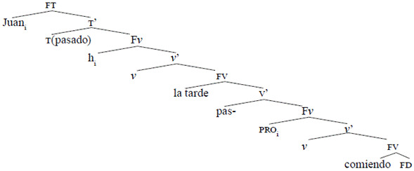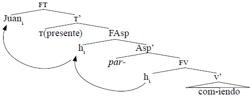 En este análisis proponemos que FAsp es proyectada por el núcleo cuasiverbal parar que contiene rasgos de [+duración] o [+permanencia]. Este núcleo no cuenta con un FD agente generado en su posición de especificador, sino que el FD agente de la FV inferior asciende sucesivamente a especificador de FAsp y, luego, a especificador de FT para recibir caso nominativo, ya que en la posición donde se generó no se le puede asignar caso. Para hacer más sencilla la exposición, omitimos el movimiento de núcleo a núcleo o, en términos más actuales minimalistas, la operación de concordancia entre el núcleo t y el núcleo de FAsp, par-. Además, no mencionamos la concordancia aspectual de comiendo; dicho núcleo verbal debería ascender a una posición de núcleo aspectual distinto para explicar su morfología y su significado eventivo.