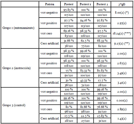 De modo similar a lo verificado en Alves y Luchini (2017), no encontramos diferencias significativas entre los dos grupos en los patrones VOT negativo y VOT positivo, en ninguna de las etapas de recolección de datos. Conforme se ha aclarado, ambos patrones ya presentan índices de aciertos bastante altos desde la etapa preinstruccional. Por su parte, en lo que se refiere al patrón VOT VOT cero natural, encontramos, tanto en el postest inmediato como en el tardío, diferencias estadísticamente significativas entre los Grupos 1 y 2 y entre los Grupos 1 y 3.