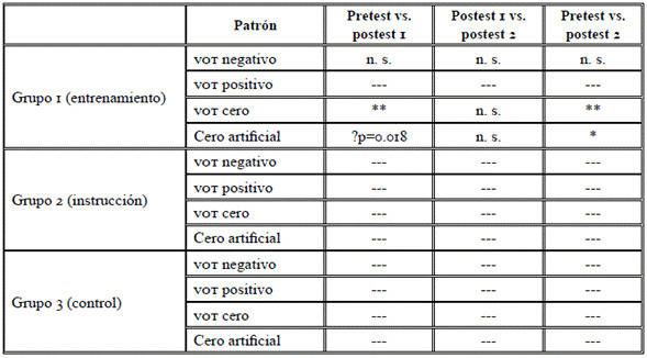 Estos resultados referentes a comparaciones intragrupos nos llevan a sugerir que el entrenamiento perceptivo (y no la instrucción explícita) contribuye a mayores índices de aciertos en la identificación de los patrones VOT cero natural o artificial. En otras palabras, el entrenamiento perceptivo contribuyó para que los participantes pasaran a tomar el VOT como pista acústica prioritaria en las distinciones de sonoridad.