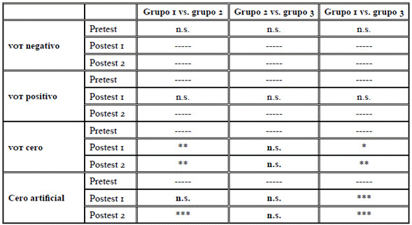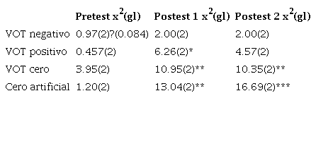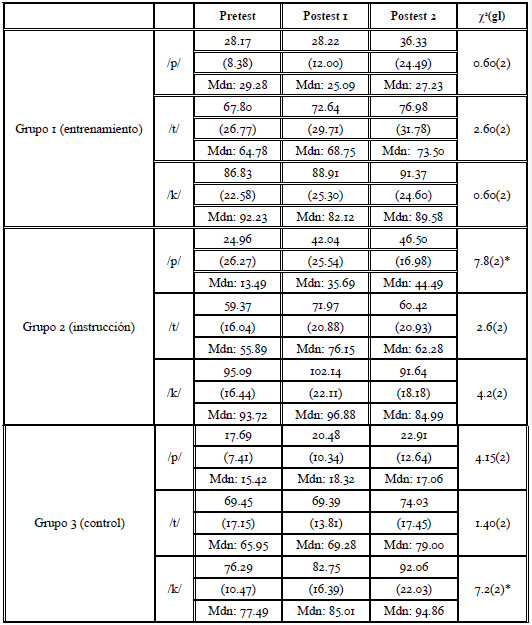 En la Tabla 5, presentamos los valores medios de VOT de cada uno de los tres grupos, así como los valores de desviación estándar y de mediana. Además, presentamos los resultados de los tests estadísticos intragrupo de Friedman.