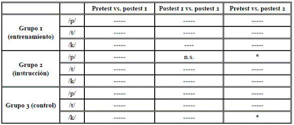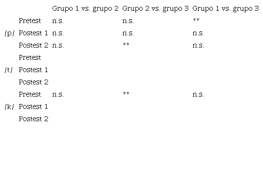 En suma, los resultados de los tests de Friedman, aunque no del todo conclusivos, parecen sugerir una cierta ventaja para el Grupo 2, aunque diferencias significativas solo se han encontrado para /p/. De hecho, dado que ya en el pretest los estudiantes del Grupo 2 presentaban valores de VOT similares al nativo para /k/, no habría margen para diferencias estadísticamente significativas entre el pretest y los postests. Por su parte, aunque observamos una diferencia grande en los promedios de VOT de /t/ entre el pretest y el postest inmediato, la disminución del promedio en el postest tardío parece no haber permitido la verificación de diferencias significativas. En la Tabla 6, presentamos los resultados del test post-hoc de Wilcoxon (con corrección de Bonferroni).