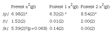 Realizamos un análisis intragrupo para verificar si hubo diferencias significativas entre las tres etapas del proyecto, considerando cada grupo por separado. Aunque los datos descriptivos revelan una cierta mejora antes y después de la instrucción en los valores de producción presentados por el Grupo 1, no encontramos diferencias significativas en las producciones de las tres consonantes de este grupo. A su vez, encontramos diferencias significativas (p < 0.001) para /p/ en el Grupo 2. Diferentemente de lo que esperábamos, el Grupo 3 también mostró una diferencia marginalmente significativa para /k/. Como una posible explicación, podemos considerar que, en el pretest, los índices de producción de VOT de /k/ del Grupo Control fueron los más bajos entre los tres grupos20. Los valores de VOT encontrados en los dos postests en el Grupo 3 son similares a los de los demás grupos, como si este estuviera «compensando» un supuesto desarrollo atrasado en la L2.