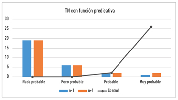 El supuesto de partida fue que la semántica de los TN es exacta y, por lo tanto, únicamente en los reactivos de control se obtendrían mayores frecuencias en el punto más alto de aceptación (MUY PROBABLE). Sin embargo, la predicción era que en los contextos lingüísticos que teóricamente aceptan interpretaciones intervalares, los participantes dirían que es algo probable (PROBABLE) que el personaje habitara en Kabea en las correspondientes variantes de cada reactivo (n+1 o n-1), de acuerdo con la condición lingüística. Por el contrario, en las condiciones que teóricamente bloquean las lecturas intervalares, se esperaba que las respuestas se concentraran en el punto más alto de rechazo (NADA PROBABLE) en las dos variantes de reactivo, tanto n+1 como n-1. La predicción de aceptabilidad de lecturas intervalares por condición lingüística se muestra en la Tabla 4.