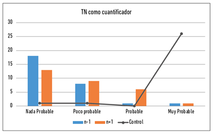 En los tres contextos evaluados (TN con función de cuantificador/sin determinante definido, TN con modalidad epistémica fuerte y TN con modalidad deóntica fuerte) se encontraron resultados diversos. En el caso del TN con función de cuantificador/sin determinante definido, las respuestas se concentraron principalmente en los dos puntos de rechazo, como se ve en la Figura 4, es decir, los participantes no aceptaron la lectura acotada inferiormente del TN. La diferencia en la frecuencia de respuestas no fue estadísticamente significativa al contrastar las dos variables n+1 y n-1 de la prueba (Prueba de Probabilidad exacta de Fisher p=0.18) y, tal como puede observarse, en ambos casos las frecuencias se concentraron en el punto más alto de rechazo10.