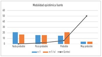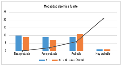 Por otro lado, en los dos tipos de condiciones modales fuertes, las respuestas fueron distribuidas de manera homogénea, tanto en el segundo punto de aceptación (2-Probable) como en los dos puntos de rechazo (4-Nada probable/3-Poco probable), como se ve en las Figuras 5 y 6. Al igual que en el caso anterior, no se encontró significatividad estadística en ninguna de las condiciones al contrastar los resultados de las dos versiones n+1 y n-1 (modalidad epistémica fuerte: Fisher p=0.38 y modalidad deóntica fuerte: Fisher p=0.91).