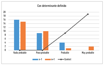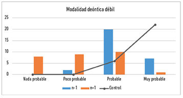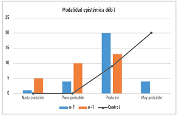 Por otro lado, a diferencia de los resultados presentados en la sección anterior, en los dos tipos de modalidad débil se confirmaron las predicciones de que en dichas condiciones los participantes aceptarían las lecturas del TN acotadas superiormente. Tanto en la modalidad epistémica débil como en la deóntica débil, las respuestas se concentraron en el segundo punto de aceptación (2-Probable) en la condición crítica n-1. En ambas condiciones se obtuvo significatividad estadística al efectuar una prueba de Probabilidad Exacta de Fisher (modalidad epistémica débil p=0.009 y modalidad deóntica débil p=0.00004). Lo anterior se observa en la Figura 7 y la Figura 8.
