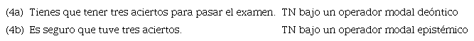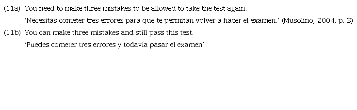 Intuitivamente, en español debería ocurrir lo mismo con expresiones modales como «tener que», «deber» o «necesitar», las cuales aceptarían una interpretación inferior del TN, como puede observarse en el ejemplo 13.