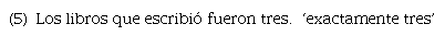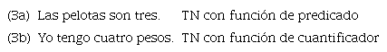 Así, la interpretación de un TN dependerá de la función que este tenga en la oración. Mientras que en la función predicativa solo aceptará las interpretaciones exactas, en la función de cuantificador también será posible darle una interpretación acotada inferiormente7. Esto no quiere decir que ambas interpretaciones serán igualmente salientes, sino que lógicamente será posible asignar interpretaciones acotadas inferiormente a los TN que funcionan como cuantificador, sin caer en una contradicción lógica.