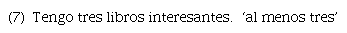 En contraste, cuando el TN es un argumento con función cuantificadora, no constituirá la propiedad que se predica de cierto ente, sino que servirá para denotar la cardinalidad de un conjunto de elementos de los cuales se predica alguna otra cosa, como en el ejemplo 7. Este conjunto no estará definido de manera unívoca. Es decir, un cuantificador denota semánticamente porciones de conjuntos con cardinalidades potencialmente más grandes. En un enunciado como el del ejemplo 7, se toma un conjunto de tres elementos de la categoría «libros» para predicar de ellos que son interesantes, pero ese conjunto es semántica y lógicamente compatible con que de hecho exista un conjunto de más de tres libros que son interesantes. En un mundo posible en donde tengo, digamos, cuatro libros interesantes exactamente, la oración del ejemplo 7 será verdadera aun cuando el TN utilizado sea menor.