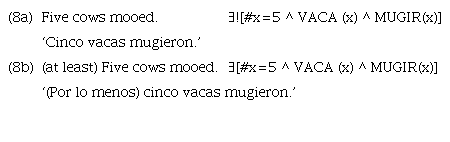 De manera general, Geurts (2006, p. 6) asume que el significado primario de un TN es exacto cuando tiene función de cuantificador como se observa en el ejemplo 8a, en donde el símbolo [!] expresa la unicidad del conjunto de 5 vacas que mugen. A partir de reglas de cambio de tipo6, se desprenderá otro significado acotado inferiormente, en donde se pierde la noción de unicidad en el conjunto y se vuelve accesible la posibilidad de que existan más de cinco vacas que mugen, como puede verse en el ejemplo 8b.