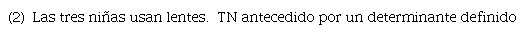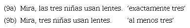 Por ejemplo, el uso del artículo definido en el ejemplo 9a presupone que el número máximo de elementos del conjunto referenciado de niñas es tres, y además que es el conjunto único, dando con ello lugar a la lectura puntual del TN «tres» (Curcó, 2015; Villaseñor, 2017). En contraste, en ausencia de artículo definido, como en el ejemplo 9b, la lectura acotada inferiormente está disponible, puesto que en este contexto lingüístico no se hace referencia a un conjunto único y máximo de elementos, sino que únicamente se predica la existencia de un conjunto de individuos que no está necesariamente definido de manera unívoca (Villaseñor, 2017).