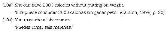 Los anteriores no son los únicos contextos que admiten lecturas de intervalo para un TN: también las licencian ciertos contextos modales. Carston (1998) proporciona los enunciados en el ejemplo 10 para explicar que los TN también pueden tener interpretaciones acotadas de manera superior. En estos ejemplos se puede observar que bajo el alcance de verbos modales como «may» o «can», en inglés, los TN pueden recibir lecturas como ‘a lo más n’. Si bien Carston (1998) no menciona directamente que dichas interpretaciones sean derivadas a causa del verbo modal, puede observarse el mismo fenómeno con otros ejemplos también mencionados en la literatura sobre TN, como es el caso del ejemplo 11. En el ejemplo 11a, la interpretación más saliente es que es necesario tener al menos tres errores para tener derecho a repetir la prueba, mientras que en el ejemplo 11b la lectura acotada superiormente se vuelve accesible, facilitando una interpretación según la cual el máximo de errores que se permite tener para pasar la prueba es tres.