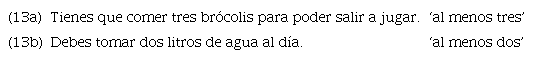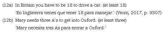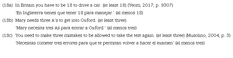 Ahora bien, cuando los TN se encuentran bajo verbos modales de necesidad u obligación, tienden a tener aparentemente una lectura acotada inferiormente de ‘al menos n’, tal como se observa en el ejemplo 12 en inglés (Yeom, 2017). En estos ejemplos, las expresiones modales «have to» y «need» involucran un significado de necesidad, y los términos numéricos marcan un límite mínimo requerido.
