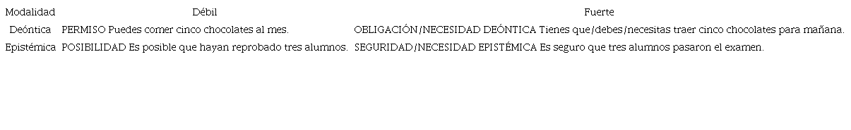 Los verbos modales en los ejemplos anteriores corresponden a las modalidades deóntica y epistémica. La modalidad deóntica trata de la deseabilidad de las acciones más que de la posibilidad de que ocurran, y va del permiso a la obligación; mientras que la epistémica expresa la factibilidad de que ocurra cierto evento, y va de la posibilidad a la necesidad. De aquí que se diga que estos tipos de modalidad usualmente se presentan con dos fuerzas distintas, una fuerte y una débil, como puede observarse en la Tabla 1.