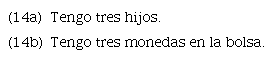 Aunado a esto, se incluyeron reactivos con referencias al mundo que pudieron haber influido en la toma de decisiones de los participantes. Es decir, existe un factor de uso pragmático que hace que enunciados como el ejemplo 14a reciban lecturas exactas con mayor fuerza que en enunciados como el ejemplo 14b. Esto se debe a que, en nuestra vida cotidiana, regularmente hablamos de cuántos hijos tenemos con mucha mayor exactitud que cuando hablamos del número de monedas que tenemos en la bolsa.