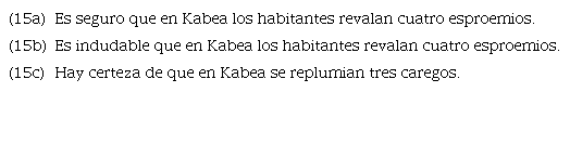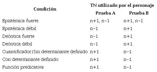 Las condiciones evaluadas fueron las enlistadas en la tabla anterior. Como puede observarse, se incluyeron dos reactivos distintos en el caso de la modalidad epistémica fuerte, cada uno con sus dos variantes (n+1 y n-1). Esto se debió a que en la fase de pilotaje de la tarea se notó que, al utilizar la construcción del ejemplo 15a, era posible que surgiera una confusión, ya que algunos de los participantes asociaban el término «seguro» no a una modalidad epistémica de certeza, sino a una expresión de seguridad, en el sentido de no ser peligroso. Los resultados del pilotaje en dicho reactivo fueron aleatorios y algunos participantes expresaron de manera oral que habían interpretado el término de manera distinta a la pretendida. Por ello, para el diseño final se decidió incluir dos formulaciones distintas de este tipo de modalidad, una como en el ejemplo 15b y otra como en el ejemplo 15c.