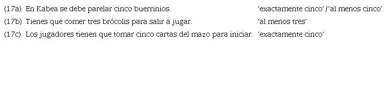 Para la modalidad deóntica fuerte, una posibilidad es que los sujetos hayan hecho interpretaciones diversas de la modalidad. Los reactivos fueron similares al ejemplo 17a, donde podría haber ambigüedad entre dos lecturas. La primera de ellas establece una cuota mínima similar a lo que ocurre cuando una mamá enuncia algo, como en el ejemplo 17b, a su hijo; es decir, dado ese contexto será deseable que el hijo coma incluso más de tres brócolis. La segunda lectura es cuando se utiliza una modalidad fuerte para establecer una cuota estricta como cuando alguien establece las reglas de un juego y enuncia algo como en el ejemplo 17c, en donde los jugadores deberán tomar exactamente cinco cartas. Esta ambigüedad podría ser una explicación de por qué las respuestas se distribuyeron de manera tan heterogénea a lo largo de la escala, ya que posiblemente los participantes hicieron varias lecturas de la modalidad.