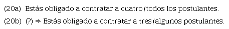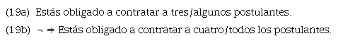 Por ejemplo, si partimos de que los términos débiles en una escala son compatibles pero no implican lógicamente12 los términos fuertes («algunos» no implica «todos»), se puede decir que del ejemplo 19a se sigue 19b; es decir, estar obligado a contratar a «algunos» postulantes no implica lógicamente que se está obligado a contratar a todos.