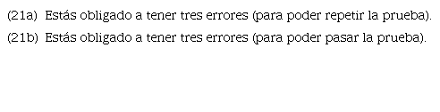 La razón por la cual resulta intuitivamente incompatible la relación de entrañamiento en el ejemplo anterior es por el verbo modal de obligación, que de alguna manera delimita una cuota mínima. Es decir, este tipo de modalidad deóntica ocurre en contextos pragmáticos que además regularmente tienen un componente de finalidad. No es la misma interpretación que se hace del ejemplo 21a que de 21b cuando la finalidad cambia. En el primer caso se impone una cota inferior, mientras que en el segundo se impone una cota superior. Esta diferencia no surge por el tipo de modalidad sino por el contexto pragmático en el que se inserta. Es posible que al no presentar un contexto pragmático referente al conocimiento de trasfondo, los participantes hicieron lecturas diversas de la modalidad misma y, por eso, no se obtuvo un patrón ni de rechazo ni de aceptación de lecturas intervalares.