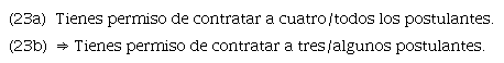 Sin embargo, contrario al ejemplo con modalidad de obligación, en este caso con modalidad deóntica débil de permiso, del ejemplo 23a sí se sigue 23b. Es decir, si tienes permitido contratar a «todos», es lógica y conversacionalmente lógico que tienes permiso de contratar a «algunos» también. Es decir, en este caso parece que la relación lógica de entrañamiento resulta bastante saliente y natural.