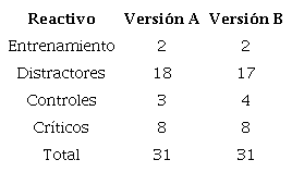Se incluyeron dos versiones, con el fin de aleatorizar las variables en los dos grupos de aplicación. Cada versión constó de 8 reactivos críticos correspondientes a las 7 condiciones lingüísticas a estudiar (se incluyeron 2 tipos de reactivos para la modalidad epistémica fuerte por razones que mencionaremos posteriormente). Asimismo, se incluyeron 2 reactivos de entrenamiento, así como 18 distractores y 7 reactivos de control. En total, cada versión constó de 31 reactivos, como ilustra la Tabla 2.