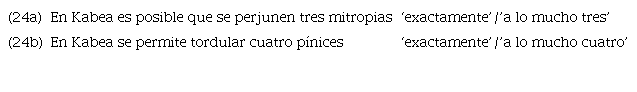 El español cuenta con mecanismos gramaticales2 para asegurarse de que la interpretación exacta no domine, como el uso de modificadores como «máximo» o «mínimo» (aunque también existen modificadores como «exactamente»). Esto habla de la conciencia de los hablantes de que ambas interpretaciones pueden estar disponibles, y seguramente marca las intuiciones de los hablantes de que la interpretación exacta tiende a ser siempre la preferida en ausencia de un contexto pragmático que sesgue hacia una interpretación no exacta. No obstante, por sí mismo, esto no resuelve la cuestión sobre lo que está codificado en la lengua.