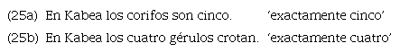 Finalmente, en los dos contextos que teóricamente aceptan solamente las interpretaciones exactas, se encontró que, en ambas variantes n+1 y n-1, las respuestas se concentraron en los dos puntos de rechazo en la escala, tal como era previsto. Esto significa que, efectivamente, no existe aceptación de lecturas intervalares cuando el TN tiene función predicativa, como en el ejemplo 25a, y cuando está antecedido por un determinante definido, como en el ejemplo 25b. Esto concuerda con las afirmaciones teóricas postuladas anteriormente por Geurts (2006) y Curcó (2015), acerca de la función predicativa, así como Curcó (2015) y Villaseñor (2017), sobre los TN con determinante definido.