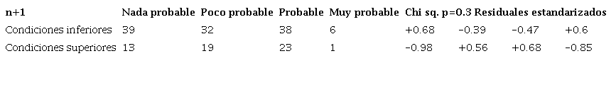 Por el contrario, en el caso de las opciones acotadas inferiormente de los reactivos (n+1) no se encontró significatividad estadística al contrastar las dos variantes de condiciones lingüísticas agrupadas (Chi sq. p=0.3). Esto corrobora que las opciones acotadas inferiormente no son aceptables incluso en los casos en los que en principio deberían serlo. Se puede observar en la Tabla 6 de frecuencias y la tabla de residuales estandarizados, que las distribuciones fueron similares en ambos tipos de condiciones lingüísticas y no hubo ningún valor que pudiera contribuir a la significatividad.