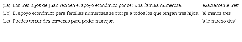 Los números constituyen una parte fundamental en la vida del ser humano en casi todas las culturas y las lenguas del mundo, por lo que resulta natural que las lenguas humanas cuenten con términos especialmente dedicados a la expresión de cardinalidades1. Al contrario de lo que predeciría el sentido común, estos términos, al ser usados en la lengua, pueden tener más de una interpretación, lo que depende de factores tanto lingüísticos como extralingüísticos. Esto se puede ver en el ejemplo 1: mientras que en el ejemplo 1a la interpretación del término numérico «tres» sería únicamente la de ‘exactamente tres’, en el ejemplo 1b el mismo término podría ser equivalente a ‘por lo menos tres/tres o más’ (esto es, se entiende que recibirán apoyo económico familias con tres o más hijos), mientras que en el ejemplo 1c la interpretación del término «dos» sería más bien equivalente a ‘a lo mucho dos’ cervezas.