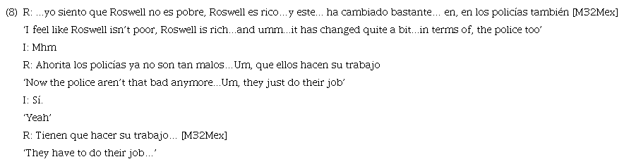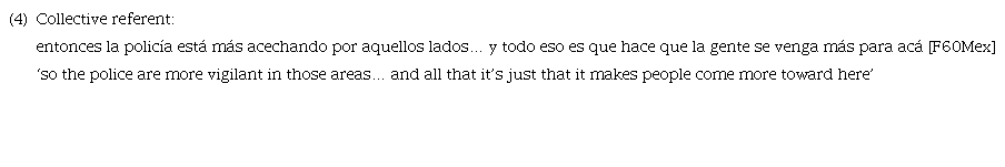 Finally, the use of collective referents, as in example 4, presents a case where variation with overt and null SPs is not possible (Otheguy & Zentella, 2012). In this example, neither la policía nor la gente could have been replaced by ella or ∅ since collective subjects cannot be referred to with pronouns in Spanish8. In sum, due to the (near) categorical use of LSs in the above contexts, these cases were excluded.
