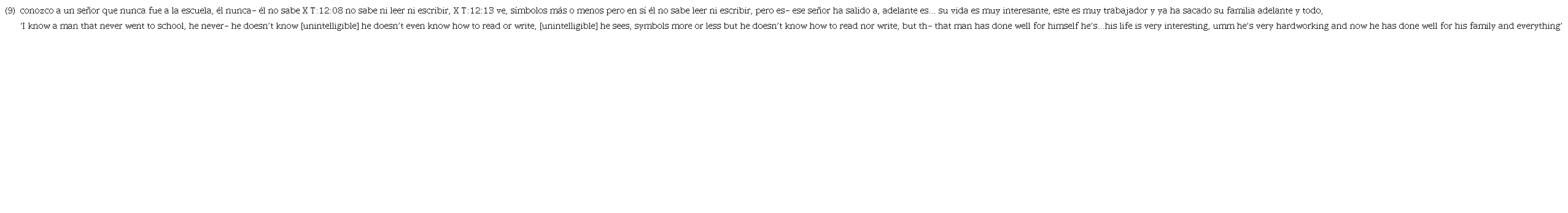 As Silva-Corvalán (1994) notes, speakers can also make the communicative choice to highlight the subject referent by means of an expressed subject, for example in situations that are counter to expectation. Example 9 below from the present data demonstrates this function for the LS ese señor ‘that man’. In the preceding discourse, the speaker talks about a man he knows who never went to school and is illiterate. The first mention of the man is made by a noun phrase in object position followed by several cases of anaphora with overt and null SPs. The speaker then uses a noun phrase in subject position (LS) to refer to the man presumably to draw the listener’s attention toward the subject referent at a point in the discourse where unexpected information is introduced: despite the man not being able to read or write, ese señor ha salido adelante ‘that man has done well for himself’10: