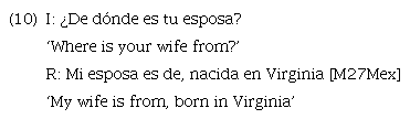 Note that in example 10 the interviewee could have used an overt or null SP but produced a LS. The motive for this could be due to the interviewer’s previous use of the same subject. Beyond simply a «repetition effect», then, this exemplifies an inter-speaker priming effect. That is, the use of mi esposa ‘my wife’ (and not ella ‘she’) by the interviewee is influenced by the interviewer’s immediately preceding use of esposa as part of the question. Further, it may also be the case that the use of LSs is influenced by priming within a single speaker’s turn, as is the case with pronominal subjects (e.g. Travis, 2005, 2007). In other words, a speaker’s own previous use of a LS may lead them to repeat the LS (instead of using a pronoun) in subsequent clauses. A quantitative analysis of a larger data set would shed some light on this issue. As stated above, only one LS was produced in the context of question/answer sequences. Pronominal subjects, then, were the dominant trend in this environment (19% overt SP and 78% null SP vs. 3% LSs).