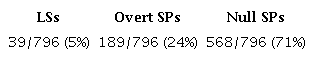 Regarding the distribution of subject forms in the current data, there were 796 total third-person verb tokens within the variable context, 39 of which were LSs, 189 were overt SPs, and 568 were null SPs (see Table 1).