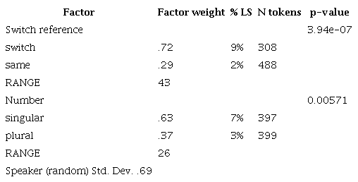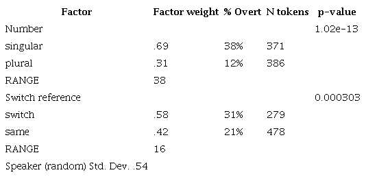 As mentioned above, a quantitative analysis of third-person pronominal forms was executed first. The independent factors included were grammatical number, switch reference, and morphological ambiguity, and it was found that all except for morphological ambiguity had a statistically significant influence on third-person pronoun usage. As would be expected, overt pronouns were favored with singular verbs and when there was a switch in subject reference.