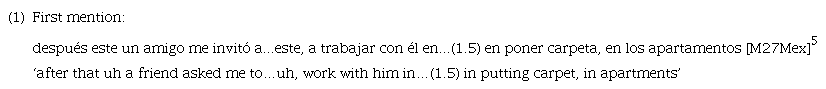 For first mention cases, the speaker introduces a referent for the first time in the discourse. In example 1 below, the speaker’s friend (un amigo) is a new referent that had not been previously mentioned in the interview. His friend could not have been referred to with él or ∅ because the listener would, presumably, not have been able to interpret the antecedent. Thus, first mention cases, generally speaking, can only be realized as LSs or else the listener is likely not able to identify the intended referent4.
