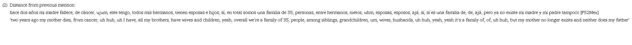 Thus, the use of mi madre (bolded) could not have varied with ella or ∅ because the use of a pronoun by the speaker would likely make it difficult for the listener to recover the intended antecedent (mi madre). This relates to the notion of accessibility in relation to pronominal subjects (Givón, 1983; Ariel, 1994). Specifically, the greater the distance between referents and their antecedents, the lower the accessibility and salience of such referents. Thus, less accessible subject referents are more likely to be marked with more coding material to enable the identification of the referent (Givón, 1983), which in (2) is a LS instead of a pronoun due to the degree of distance from the previous mention of mi madre. In other words, the distance (5 clauses back) of the first case of mi madre (underlined) from the target structure makes a LS necessary for the subsequent reference to the speaker’s mother. Other cases of distant previous mention involved a greater number of clauses intervening between the reference and the target (e.g. 10+ clauses), including cases where the previous mention was found in an entirely different speech turn.
