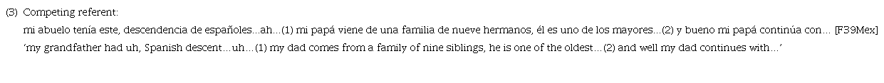 Furthermore, competing referents also make the use of LSs necessary. The speaker in example 3 produced the subject form mi papá and could not have used a pronoun to refer to her father because of the presence of the previous subject mi abuelo. The use of él or ∅ in place of mi papá would indicate reference to her grandfather. That is, although a pronoun could have occurred in place of mi papá, it would not have referred to the same subject (her father)7. On the other hand, the subsequent mention of mi papá in this example (underlined) was included in the present analysis since it does not have a competing referent, is not a first mention, and does not have a distant previous mention. Specifically, there is continuity in reference in that the previous subject él also refers to the speaker’s father. In this case, the speaker could have alternatively said élcontinúa or ∅continúa.