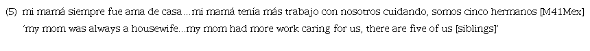 Thus, the second mention of mi mamá ‘my mom’ does not introduce the referent since the referent was already introduced by the speaker in the immediately preceding clause. Despite Silva-Corvalán’s (1994, p. 148) assertion that «if the subject is coreferential with the subject of the preceding sentence, [...] a full subject NP is not acceptable in Spanish», we do see evidence of speakers producing LSs in such contexts9. However, in the majority of cases in the Georgia data (95%) the previous coreferential mention was in object position rather than subject position as in example 6: