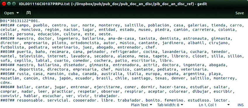 El programa IDL se alimenta de datos organizadas en hojas de notas tipo texto sin formato, y el software arroja tablas de Excel (Tablas 1 y 2) con los índices de disponibilidad léxica, es decir, organiza los vocablos por jerarquía de aparición según el lugar donde fueron escritos en la encuesta. Esto muestra cuáles son los que están en el léxico frecuente del hablante por estar escritos en la parte superior de las columnas y luego, de forma descendente, los que aparecen hasta el final (responde al sustento psicológico de la encuesta, el asociacionismo). Esto permite distinguir entre léxico frecuente y léxico disponible.