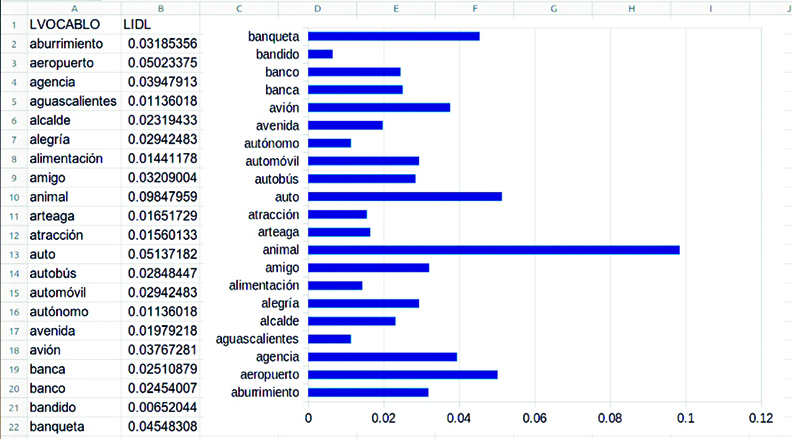 En la sección anterior, básicamente se contabilizaron los vocablos por su frecuencia en todos los centros de interés; sin embargo, cada vocablo tiene relevancia basado en su correspondiente índice de disponibilidad. Mediante el lenguaje R, se desarrolló el código necesario para calcularlo; el tiempo de procesamiento para cada uno de los centros de interés fue de 6.5 segundos aproximadamente. La fórmula utilizada como referencia para el cálculo del IDL es la propuesta por López-Strassburguer (López, 2003):